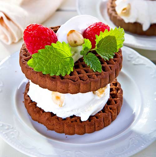 Для печенья: 125 г муки, 1/2 ч. л. разрыхлителя теста, 40 г какао-порошка, 125 г сливочного масла, 100 г сахарной пудры, 1/2 ч. л. соли, 1/2 ч. л. ванилина. Для мороженого: 400 мл сливок (33%), 150 г сахара, 1/2 пакетика ванильного сахара, 3 яичных белка, 70 г орехов.