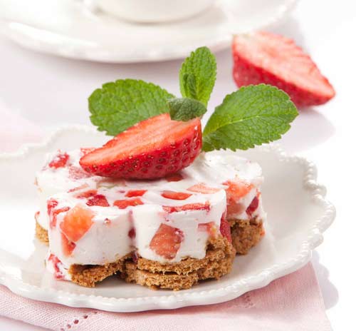 Желатин замочите в небольшом количестве холодной воды. Ягоды слегка разморозьте и нарежьте. Печенье раскрошите. Прямоугольную форму выстелите пищевой пленкой и на дно уложите печенье. Творог протрите через частое сито. Затем перемешайте с йогуртом, сахаром и лимонной цедрой. Желатин распустите на горячей водяной бане и влейте в творожную массу. Добавьте клубнику и хорошо перемешайте. Получившуюся массу вылейте в форму на печенье и уберите в холодильник на 2 часа. Перед подачей десерт выложите на блюдо, пленку снимите. Верх украсьте лимонными дольками, мятой и подавайте.