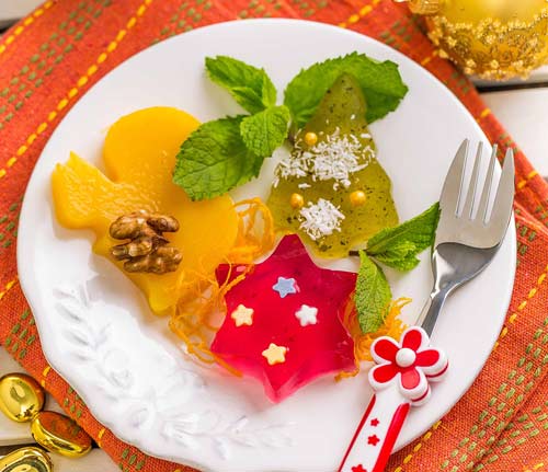 Желатин замочите и разделите на три части. Для зеленого желе измельчите в блендере шпинат с яблочным соком и процедите через марлю. Добавьте сок лимона, 1/3 сахара и нагрейте. Снимите с огня и распустите в нём 1/3 желатина. Для красного желе нагрейте морс с 1/3 сахара, добавьте 1/3 желатина и нагрейте почти до кипения. Для оранжевого – нагрейте апельсиновый сок с оставшимся сахаром и желатином почти до кипения. Приготовленные смеси разлейте по формочкам, дайте остыть, а затем уберите в холодильник на 3 часа. При подаче можно использовать, мяту, цедру, сахарную посыпку, кокосовую стружку, орехи и пр.
