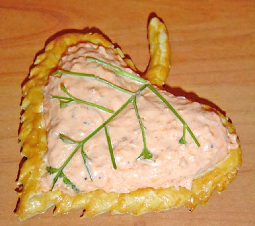 Слоеное тесто немного раскатайте и, используя настоящий лист или трафарет, вырежьте фигурки листьев. Отступив от края, ножом сделайте надрезы (но, не насквозь). Смажьте края яичным желтком. Выложите листья на противень, застеленный пергаментной бумагой и выпекайте при температуре 180°C. Пока листья горячие, уберите серединку. Для начинки взбейте сливки, добавив немного пищевого красителя, чтобы крем соответствовал цвету осенних листьев. Натрите на мелкой терке сыр, измельченные орехи и лук и добавьте всё к взбитым сливкам. Посолите и поперчите по вкусу. Всё аккуратно перемешайте и охладите в течение часа. Затем этим кремом наполните тарталетки-листики, украсив сверху тертыми орехами и веточками петрушки.