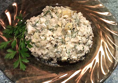 2 соленых огурца, 200 г шпрот, 250 г картофеля, 1 луковица, 60 мл майонеза, соль, черный молотый перец – по вкусу.