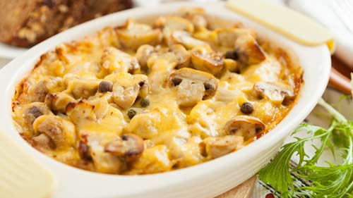 Обжарьте в растительном масле измельченный чеснок и перец чили, туда же добавьте лук и розмарин. В ту же сковороду выложите нарезанные грибы, приправьте по вкусу и жарьте до золотистого цвета. Отварите картофель в мундире, почистите и нарежьте кружочками. Взбейте яйца со сливками и тертым твердым сыром. Выложите слоями грибы, моцареллу, картофель, фету, сырную заливку и запекайте 25 минут при 180°C.
