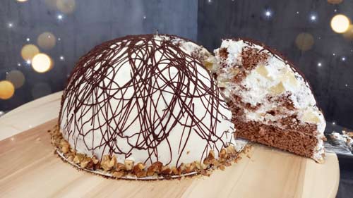 Для бисквита: 5 яиц, 180 г сахара, 1 ст. (120 г) муки, 1 ч. л. разрыхлителя, 30 г какао-порошка. Для крема: 500 г сметаны (жирностью 20-30%), 350 г вареного сгущенного молока, 200 г сливок (жирностью 33%). Для начинки: 2-3 колечка маринованных ананасов. Для украшения: 50 г темного шоколада, 5-6 грецких орехов.