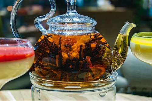 Сочную грушу нарежьте ломтиками, добавьте листья свежей мяты и капельку сладкого грушевого сиропа. Туда же добавьте черный чай «Ассам», китайский чай ручной работы «Цветок жасмина» и залейте горячей водой. Особенностью китайского чая является то, что во время заваривания бутон раскрывается и внутри чайника распускается настоящий цветок, поэтому готовый чай подавайте в прозрачном чайнике.