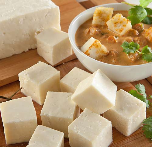 Для створаживания 1 л молока понадобится: 2 ст. л. лимонного сока, либо 1 ч. л. лимонной кислоты, либо 150 мл «живого» йогурта или кефира, либо 250 мл кислой сыворотки. Вскипятите молоко в кастрюле с толстым дном, влейте в него тонкой струйкой кефир, постоянно помешивая. Через пару минут творог отделится от сыворотки и всплывет на поверхность. Тогда процедите содержимое кастрюли через марлю. Плотно завяжите марлю с творогом и положите под пресс (кастрюлю с водой) на несколько часов. Такой сыр в Индии используют как основу для многих блюд, либо как отдельное блюдо.