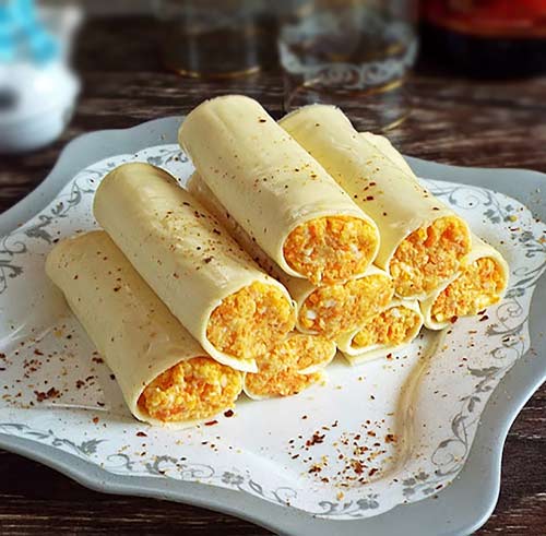 Яйца отварите вкрутую, остудите, очистите. Чеснок очистите. Обычный сыр, морковь, чеснок и яйца измельчите блендером. Заправьте майонезом и перемешайте. В середину каждой пластинки плавленого сыра выложите несколько столовых ложек начинки и закрутите сыр трубочками.