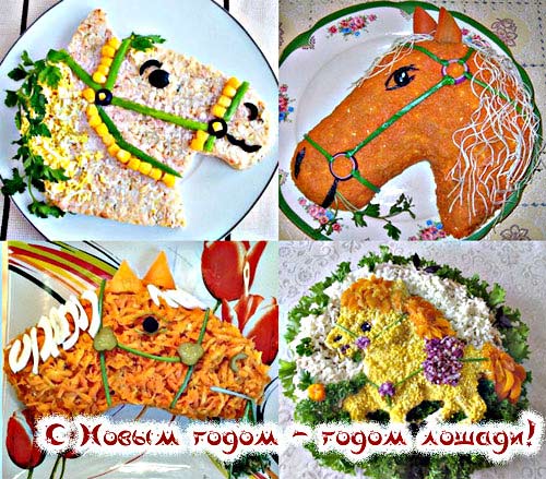 2014 год – год Лошади. Давайте делать салаты в ее честь. Например, «Лошадку в кукурузе». Салат сытный, но главное в нем – форма! Как вы догадываетесь, это лошадка или хотя бы ее гордая голова… В основе этого спецновогоднего салата может быть любой салат – и оливье, и крабовый, и овощной, например, кукурузный. Включайте свою фантазию!