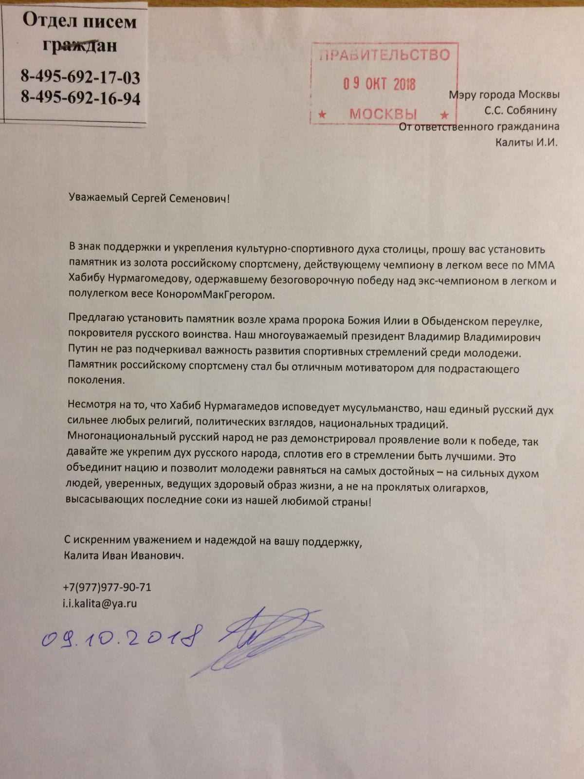 Московский бизнесмен, с исторической фамилией Иван Калита, предложил мэру Москвы С.С.Собянину установить памятник российскому спортсмену Хабибу Нурмагомедову.