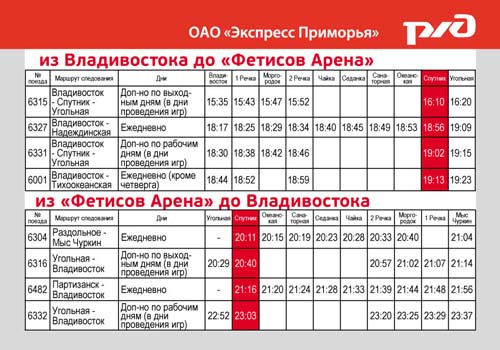 Помимо этого, в случае увеличения пассажиропотока и возможных изменениях в продолжтельности матчей, компания не исключает возможности запуска дополнительного электропоезда от станции «Угольная» до Владивостока на обратную доставку болельщиков с отправлением от остановки «Спутник» в 23.30.