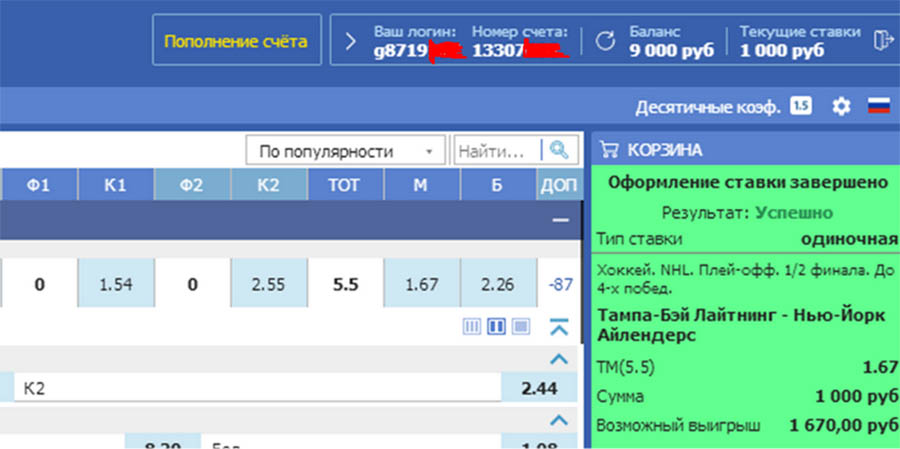 Ставка была принята, о чем свидетельствует списание с виртуального счета 1000 рублей. После того, как матч закончится, ставка будет рассчитана. В случае проигрыша по сделанной ставке (в основное время матча будет забито более 5 шайб), баланс останется тем же – 9000 рублей. В случае выигрыша по сделанной ставке (в основное время матча будет забито менее 6 шайб), счет увеличится до значения 10 670 рублей.