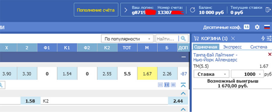 Была выбрана ставка ТМ5,5 шайб с коэффициентом 1,67. После того, был произведен щелчок левой кнопкой мыши по выбранному коэффициенту, ставка появилась в КОРЗИНЕ, которая находится в правом верхнем углу. Осталось лишь указать размер ставки (была поставлена 1000 рублей), и нажать на кнопку «Сделать ставку».