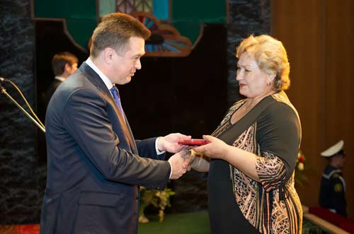 На снимке: губернатор вручает удостоверение ветерана труда.