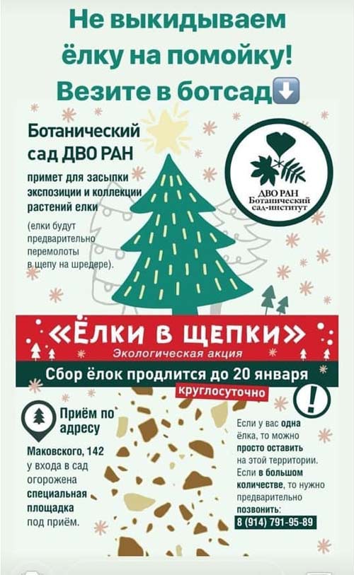 У нас елки тоже принимают в Ботаническом саду ДВО РАН для присыпки экспозиции и коллекции растений, но чаще всего их сжигают, как рассказало Общественное телевидение Приморья пару лет назад.