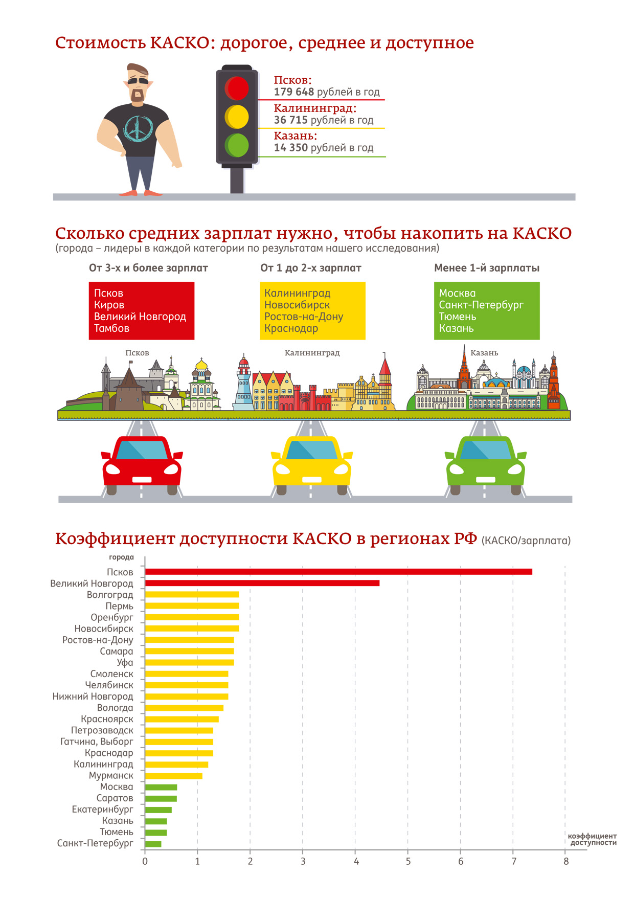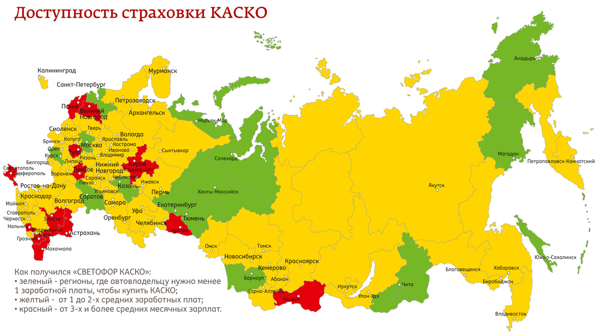 Так, в Москве и Петербурге этот показатель на «зеленом» уровне: всего 0.6 для столицы – т.е. 60% средней зарплаты москвичу достаточно для покупки КАСКО, и 0.3 для или 30% зарплаты – для петербуржцев. Одни из самых высоких показателей у жителей Пскова – больше 7 заработных плат – и Великого Новгорода – почти 4,5 зарплаты необходимо будет отложить новгородцам для приобретения ежегодной страховки.