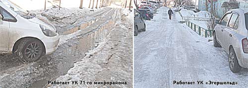 Впрочем, не одна УК 71-го микрорайона повинна в том, что город по уши в снегу, на март, очевидно, надеется и УК «Эгершельд». Возле тупика Шевченко, 9, явно никто и не пытался чистить придомовую дорогу, что касается основной, по которой машины к «Тинро» подъезжают… Протоптали колею, где-то снег подтаял. А вообще, к середине дня снег превратился в кашу, что облегчило проезды ко многим домам. Правда мартовская слякоть, которая служит добрую службу днем, ночью превращается в гололед.