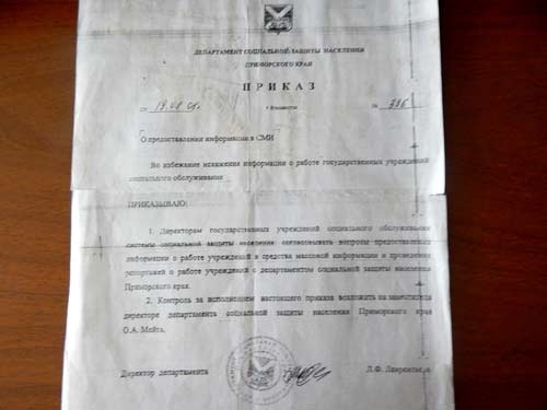 В моем архиве хранится приказ за номером 336 от 19.08.08 «О предоставлении информации СМИ» за подписью Л.Ф. Лаврентьевой и скрепленная печатью. Смотрите фото.