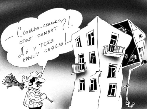 Ну, потекла после капремонта крыша и пусть течет. До ремонта текла, и ничего, жили. Ну, не закрываются двери — пусть держат открытыми. Кирпичи при капремонте уложили под крышу – угрожают упасть на голову — ходить перебежками?