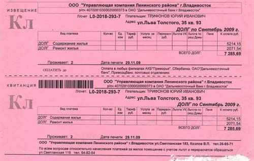 В сентябре 2009 г. РКЦ разослало квитанции розового цвета. В ней была указана моя задолженность с начала года в размере – 7285,69 рубля. До появления этой квитанции ни долга, ни претензий от УК не было и нет, т.к. по строке – «Содержание жилья» я платил и плачу как законопослушный квартиросъёмщик – житель города.