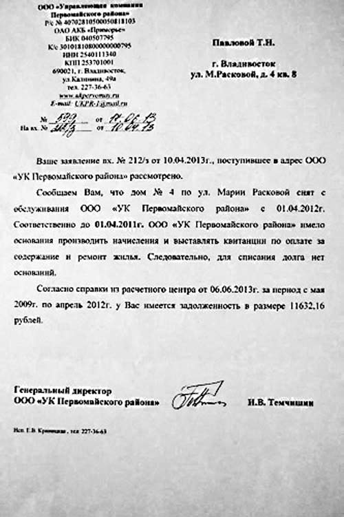В завершение Павлова просит разобраться с УК. В подтверждение своих слов она приложила ответ гендиректора УК «Первомайского района», в котором написано, что с 1.04.2012 года дом снят с обслуживания и УК не имеет права выставлять жильцам квитанции с 1.04.2011 года. А согласно справке из расчётного центра, у Павловой долг с мая 2009 по апрель 2012 года — 11,6 тысяч рублей.