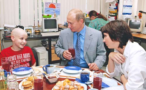 В 2005 г. Путин навестил пациента Диму Рогачева в НИИ детской гематологии. Дима скончался в 2007 году после операции в Израиле. Спустя несколько лет Центру присвоили имя ребенка. Фото: НМИЦ им. Дмитрия Рогачева