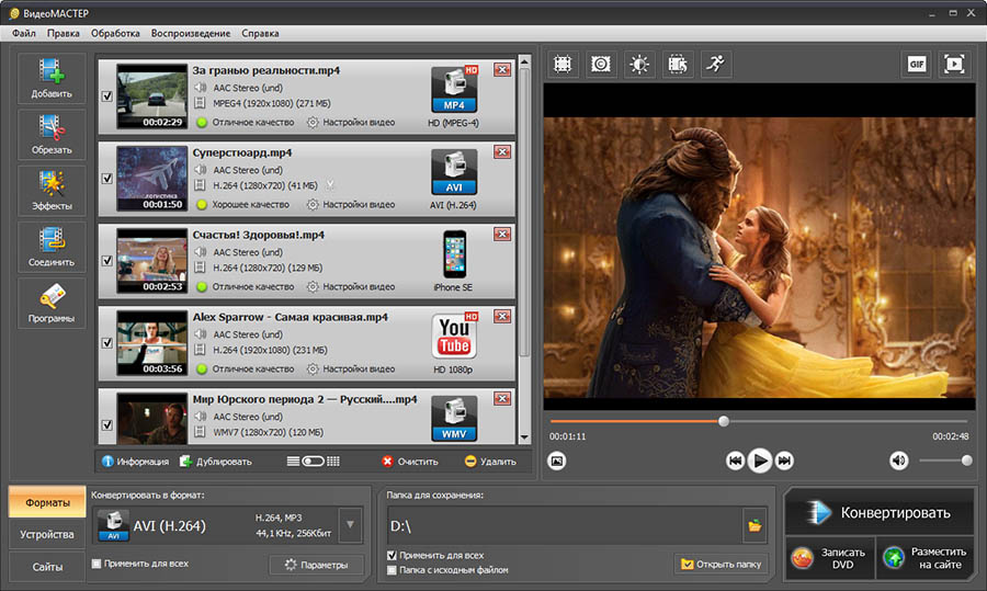 На сайте video-converter.ru есть прекрасная возможность каждому пользователю бесплатно скачать конвертер видео ВидеоМАСТЕР на русском языке. Данный конвертер вошел в ТОП 3 видео конверторов в мире. Здесь конвертирование видео происходит более, чем в 350 форматов, включая HD. На сайте имеются десятки уже встроенных спецэффектов.