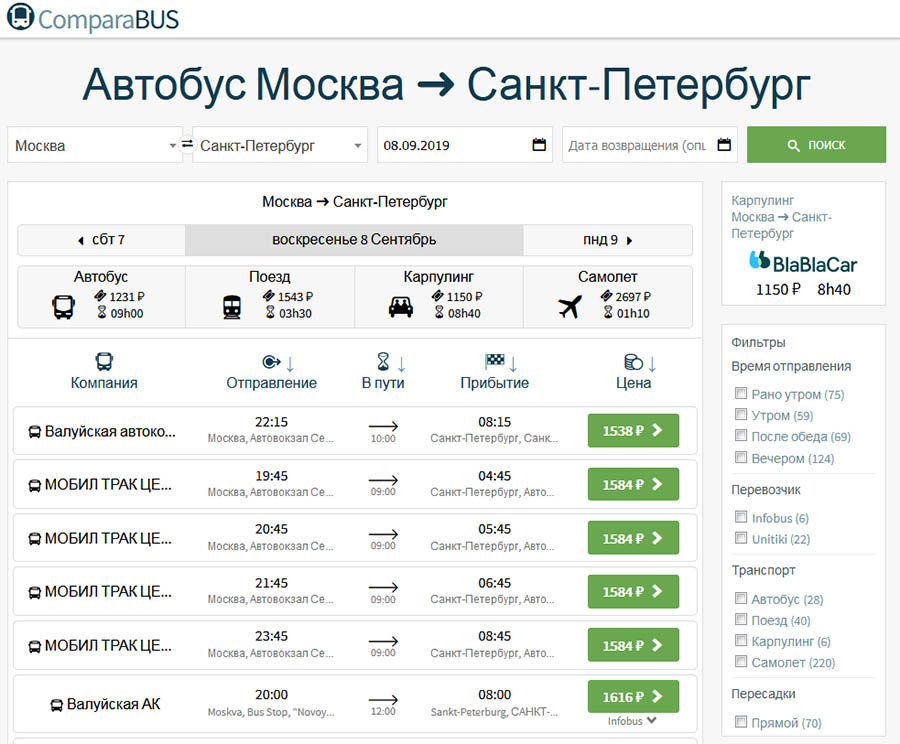 Посетив сервис «КомпараБУС», можно за короткий промежуток времени и не выходя из собственной зоны комфорта сравнивать цену на билеты и рейсы на карпулы, самолеты, поезда и автобусы, после чего оформить бронь или купить билеты онлайн.