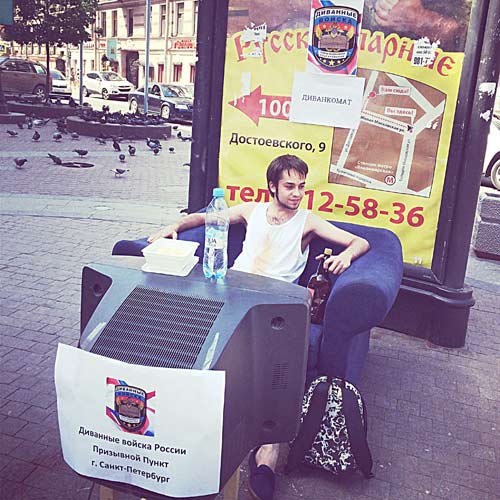 В центре города по адресу ул. Большая Московская, д. 8/2, открылся прием в «Диванные войска России». На месте «призывного пункта» был организован перформанс, изображающий типичного пользователя интернета, призывающего к насилию, агрессии в отношении граждан других государств. Каждому кто поддержит агрессивные лозунги, было предложено стать военнослужащим Диванных войск РФ.