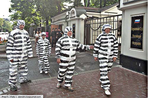 Пикетчики в одной из подворотен рядом с судом переоделись в полосатую форму, напоминающую тюремную робу. Это символизировало то, что все мы живем в полицейском государстве, где каждого человека можно посадить в тюрьму вне зависимости от того, виновен он или нет.