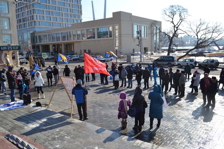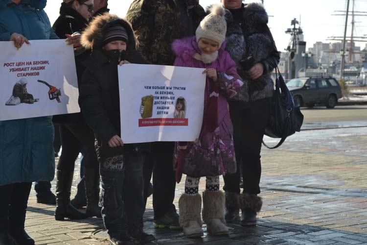 В субботу во Владивостоке на корабельной набережной состоялся митинг против роста цен на топливо. На акции присутствовали коммунисты, представители товарищества инициативных граждан, а так же небольшая толпа людей пришедших поддержать митингующих.Требования выдвигаемые участниками акции были следующие: 1. Отменить акцизы на нефтепродукты, продаваемые на внутреннем рынке.2.Поставить пред государственной компанией Роснефть цель-удовлетворение потребности граждан в доступных ценах на топливо, а не извлечение прибыли.3.Запретить добывающим компаниям регистрироваться в оффшорах.4.Разработать и принять долгосрочную программу снижения стоимости Владения и эксплуатации автомобилей и автотехники через снижение и отмену налогов и таможенных пошлин, отмену запретов и ограничений, не имеющих отношения к безопасности дорожного движения, снижение стоимости топлива.
