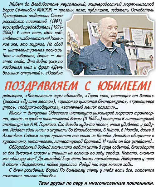 Живет во Владивостоке неугомонный, жизнерадостный моряк-книголюб Борис Семенович МИСЮК – прозаик, поэт, публицист, издатель. Основатель Приморского отделения Союза российских писателей (1991), его первый председатель (1991-2008). У него есть своя собственная изба-читальня! Конечное же, это журнал. Но свой – интеллектуальная роскошь. Что и говорить, Борис – мастер слова. Это видно уже по названиям книг и фраз: «День больших открытий», «Ошибка ревизора», «Космические игры облаков», «Тугая коса, растущая от винта» (рассказ «Лучшее место»), «циклон за циклоном бесперекурно», «кренящееся утро», «подушка-подружка», «заплечный мешок памяти»...