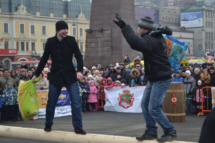 Cегодня на центральной площади Владивостока прошли народные гуляния “Широкая Масленица”. Несмотря на пасмурную и прохладную погоду на площади было весьма многолюдно. Все желающие могли угоститься вкусным пловом, шашлыками и попить горячего чаю с блинами. Кроме этого для пришедших проводились различные конкурсы с призами. Бой подушками и бег в мешках и другие развлекательные мероприятия.