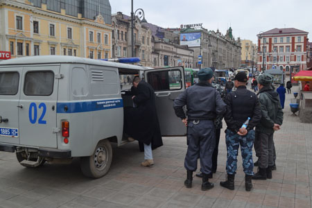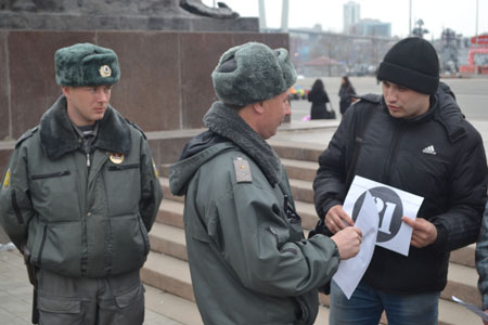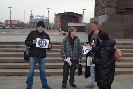 Несмотря на то что данное мероприятие проходило в виде простого мирного собрания через некоторое время к участникам акции подошли сотрудники полиции и не представившись и не предъявив служебного удостоверения стали утверждать, что участники проводят несанкционированный пикет. В Федеральном законе Российской Федарции от 19 июля 2004 года №54 О собраниях,митингах,шествиях и демонстрациях говориться, что пикетирование - форма публичного выражения мнений, осуществляемого без передвижения и использования звукоусиливающих технических средств путем размещения у пикетируемого объекта одного или более граждан, использующих плакаты, транспаранты и иные средства наглядной агитации. У участников данной акции с собой кроме простых бумажек c цифрой 31 больше с собой ничего небыло. Но данное обстоятельство не убедило сотрудников полиции и всех собравшихся доставили в Ленинское отделение полиции, где на них был составлен протокол об административном правонарушении по статье 20.2.