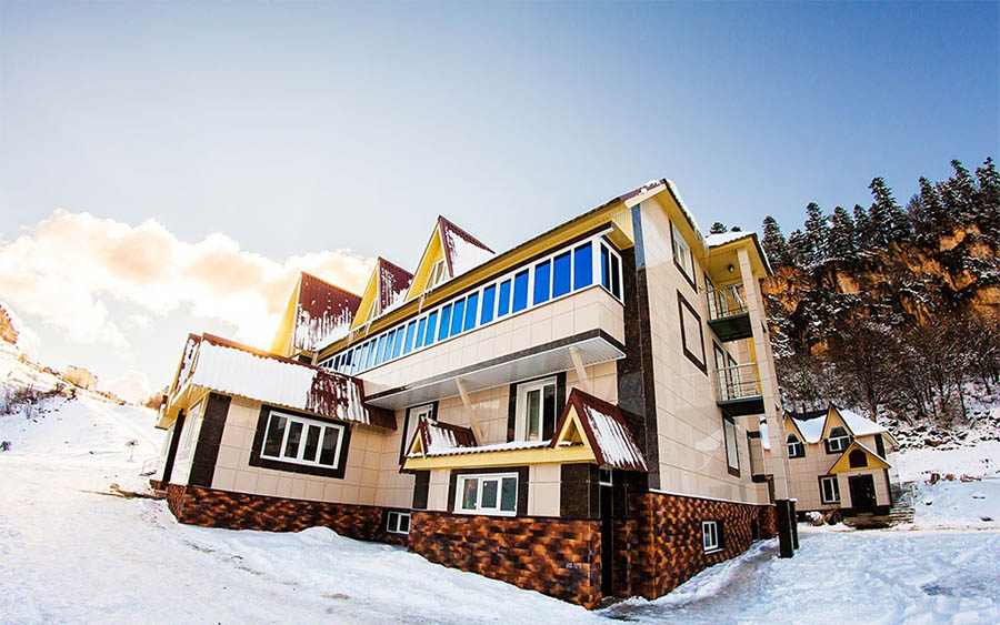 Важно заметить, что здание гостиницы, куда нас поселили, а также дополнительные постройки выстроены из натурального дерева. Внутри номера обшиты древесиной, отчего в них приятно отдыхать днем, а ночью будет гарантирован оздоровительный сон. Нас, кстати, с детьми поселили в четырехместный номер, в котором был туалет и холодильник, а также телевизор и душ. В здании гостиницы имеется великолепная терраса, с которой также можно увидеть все великолепие заснеженных горных вершин Западного Кавказа.