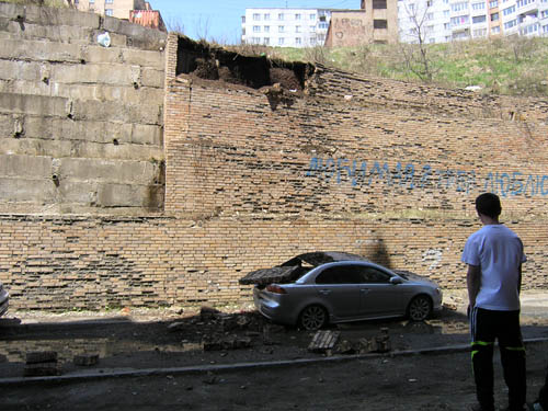 Как сообщают жители улицы Тунгусской, 69 во Владивостоке, 7 мая в 13:40 обрушилась опорная стена, которая поддерживала грунт сопки возле дома №69. Куски опорной стены упали на легковую машину, однако, насколько известно жильцам, никого не ранило. Самый большой кусок, который упал на машину длиной около метра, шириной около полуметра. Сама опорная стена по высоте между вторым и третьим этажом, а толщиной в полтора кирпича.