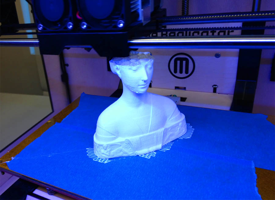 После того, как созданы файлы с 3D-моделями, запускается сам процесс печати 3D-изображений. Для этого подготовленный файл указанных выше форматов помещается в ПО ZPrint, в котором при необходимости изменяется масштаб создаваемого объекта и происходит ориентация его в камере построения с указанием количества требуемых экземпляров. Программа ZPrint позволяет самостоятельно разбить объект на сотни поперечных сечений, которые являются уровнями модели, создаваемой в принтере. После того, как необходимые параметры будут заданы, объект выводится на печать. Здесь вступает в работу 3D-принтер, печатающий каждый новый уровень по принципу «слой за слоем», что в итоге создает физическую модель, подвергающуюся по окончании процесса сушке и последующему извлечению.