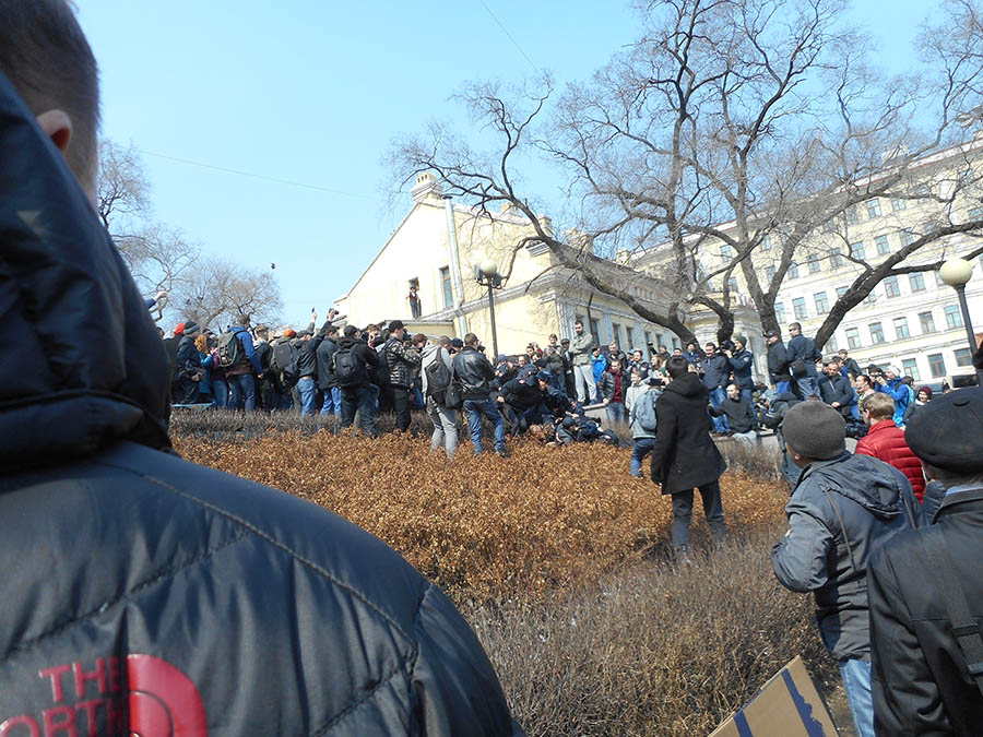 Народу собралось много. Сначала счет шел на сотни, но к окончанию первого часа «под пальцем», на лестницах, на крыше расположенного рядом супармаркета собралось уже больше тысячи людей - в основном молодежь, да пара сотен зрителей на тротуаре внизу. Зрители не расходились, прибывали новые, хотя митинга как такового не было, поскольку не было ни микрофона, ни мегафона. Было несколько плакатов, была вырезанная из картона или фанеры раскрашенная фигура Медведева, к которой были привязаны кеды (настоящие). Собравшиеся время от времени скандировали «Мы против коррупции», «Медведева в отставку» и подобные.
