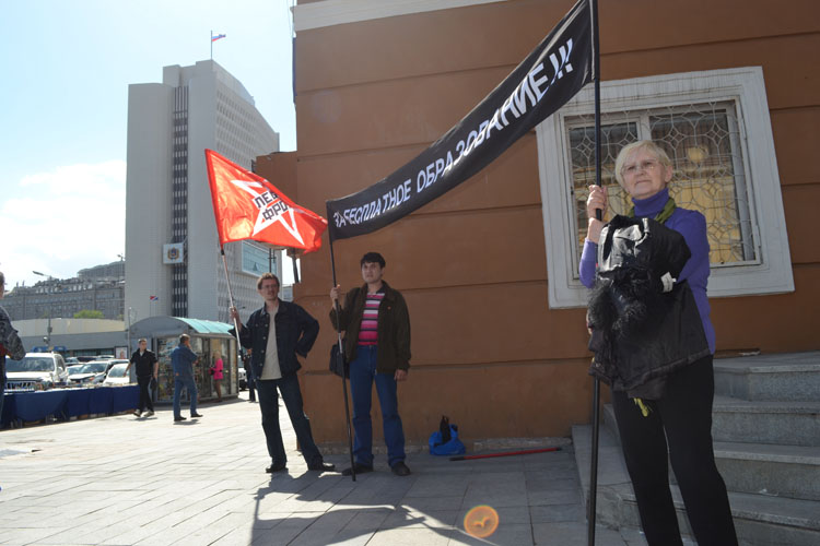 Так же всем желающим участники пикета раздавали соответствующие листовки и газеты. Проходящие мимо преподаватели Дальрыбвтуза оказывали активную поддержку участникам акции и делились своими наболевшими проблемами в сфере образования.