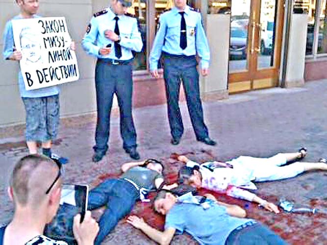 Активисты провели акцию против принятия закона о запрете гей-пропаганды среди несовершеннолетних. Закон, запрещающий говорить детям о равенстве гомосексуальных и гетеросексуальных отношений, президент Владимир Путин подписал 30 июня. Одним из авторов закона является депутат Госдумы Елена Мизулина. В соответствии с этим документом запрещается пропаганда «нетрадиционных сексуальных отношений».