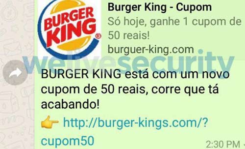 Потенциальная жертва получает в группе или от другого пользователя WhatsApp сообщение об «акции Burger King» и ссылку на розыгрыш. Перейдя по ссылке, пользователь обнаружит комментарии, которые имитируют реальные отзывы на Facebook, мотивирующие участвовать в акции.