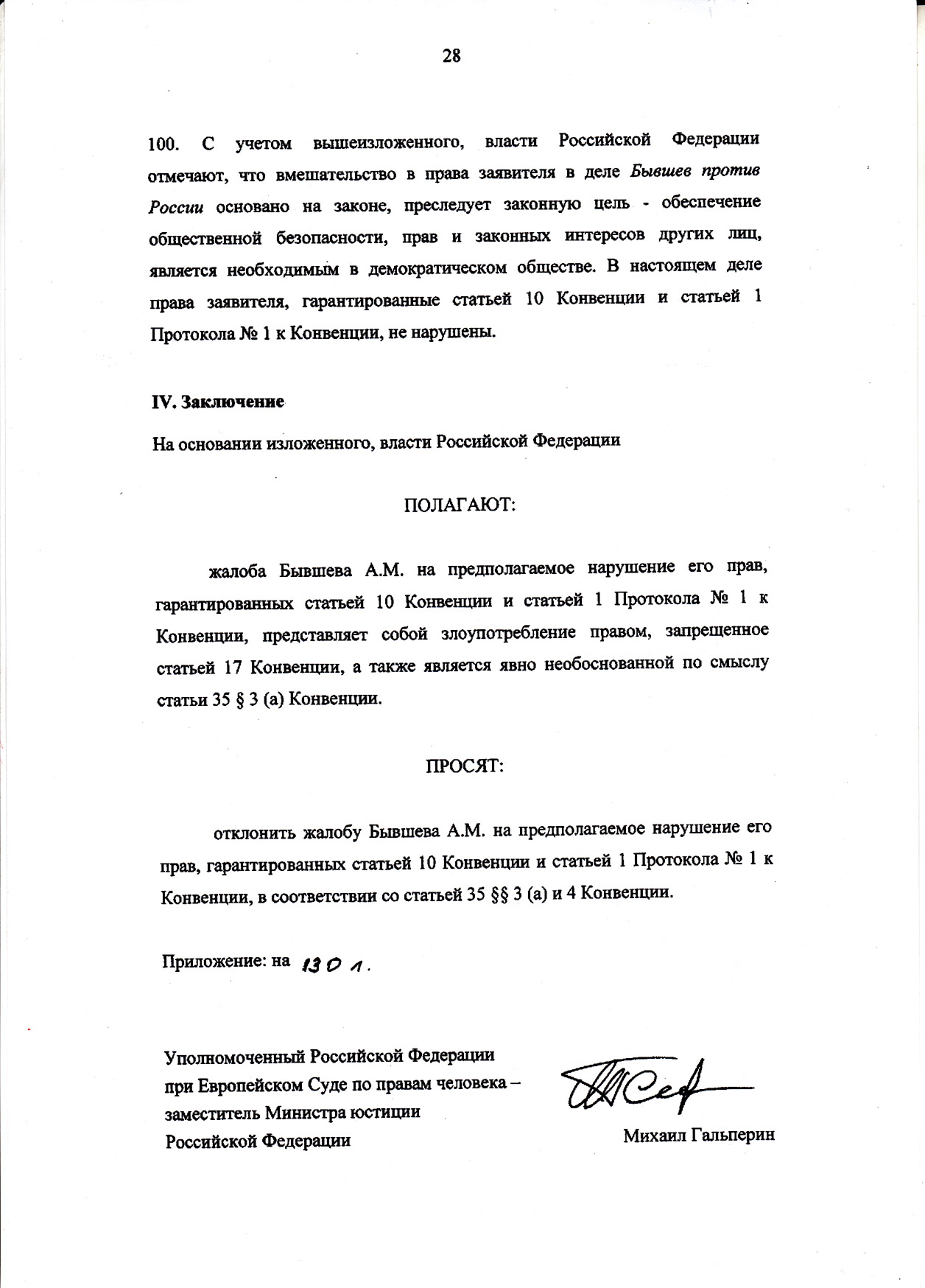 И подобных откровенных ляпов и нестыковок в данном "документе" полно. Главная его мысль проста: Бывшев был осуждён правильно, а все мероприятия по нейтрализации его преступной деятельности были осуществлены в интересах "обеспечения общественной безопасности." То есть, по мнению руководства России, если бы меня своевременно не выгнали из школы, не объявили национал-предателем, внеся в список действующих экстремистов и террористов России, и не заблокировали все мои и моих родителей банковские счета, то ещё неизвестно, устояли бы основы конституционного строя Российской Федерации.