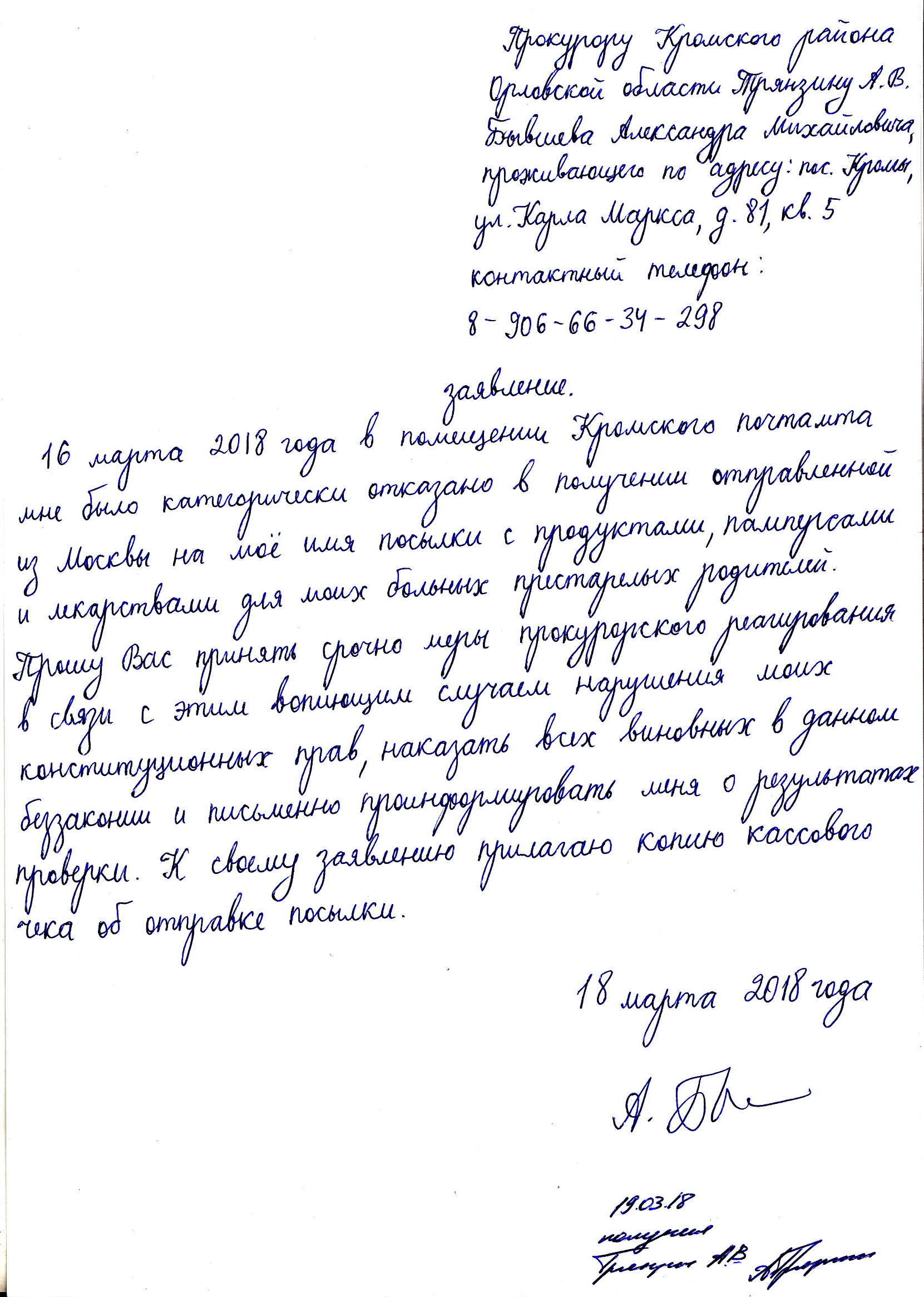 А поскольку её подарок я так и не получил, то решил написать на имя начальника Кромской почты заявление, где спрашивал, по какой причине данная посылка до меня не дошла и когда мне её собираются передать.)