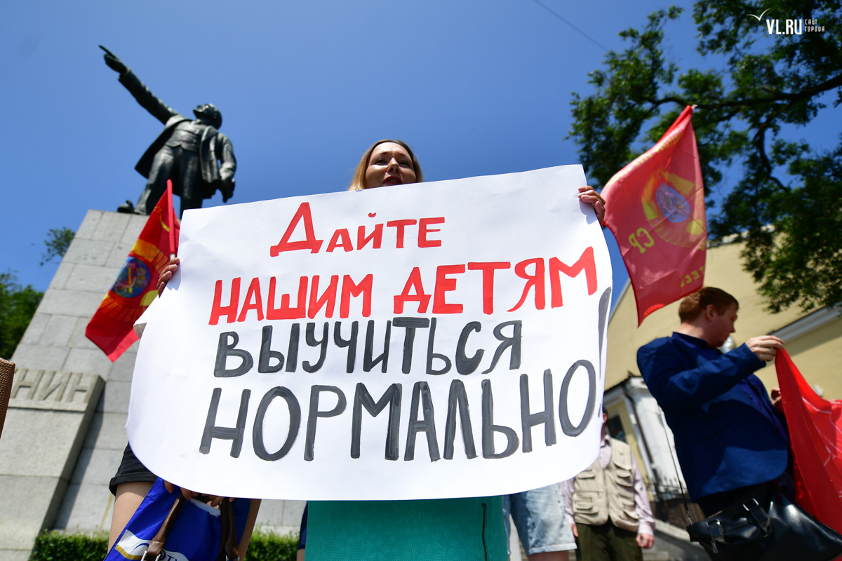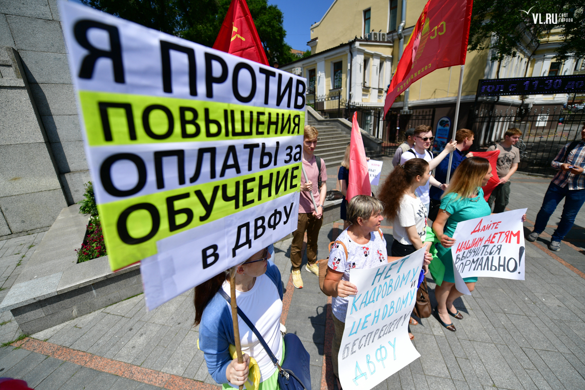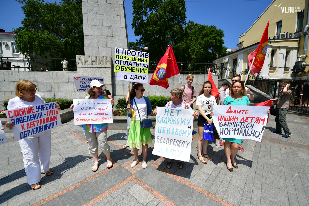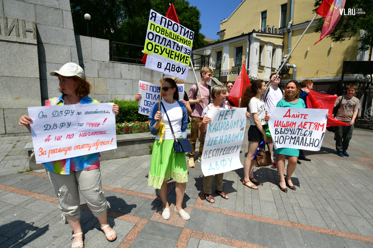 110 000 рублей за год – столько придется выложить родителям гимназистов Дальневосточного федерального университета. С мая им сначала грозили поднять цену на обучение, потом обещали оставить ее «терпимой» (83 200 рублей), потом держали в неведении. И лишь 25 июня, когда уже стало поздно подыскивать другую хорошую школу, объявили новые цены. В пятницу, 13 июля, мамы педагоги и дети вышли на митинг против цен на привокзальную площадь.