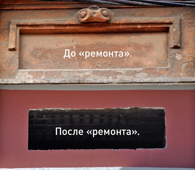 Правда, здесь, слава Богу, пока не особо строят новые хрущёвки, а, в основном сносят доведенные до руин памятники архитектуры, да ещё активно «ремонтируют». Так называются те манипуляции по освоению казенных средств или собранных с жильцов бюджетов, в результате которых фасады зачастую начинают выглядеть хуже, чем выглядели до ремонта, теряя при этом свой исторический облик.