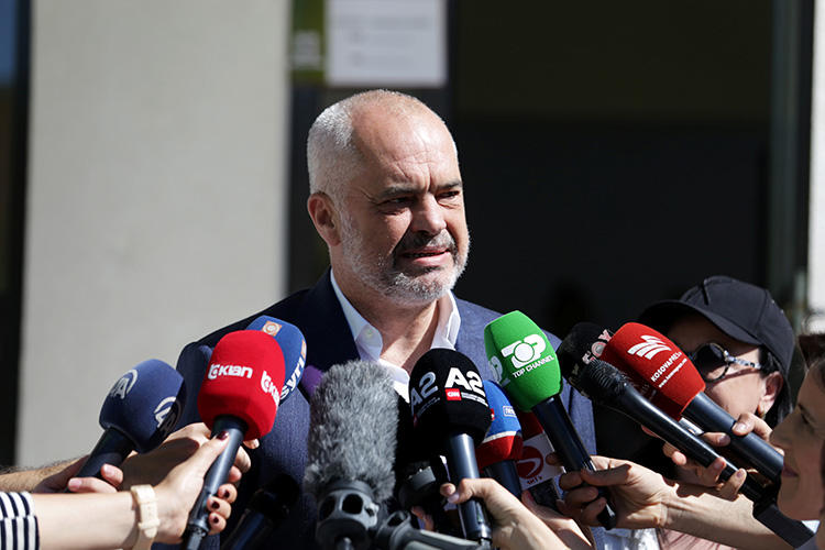 Albania's Prime Minister Edi Rama speaks to the media outside a polling station near Tirana on June 30. A press freedom mission raised several issues with Rama last month, including unresolved attacks on journalists and draconian laws. (Reuters/Florion Goga)