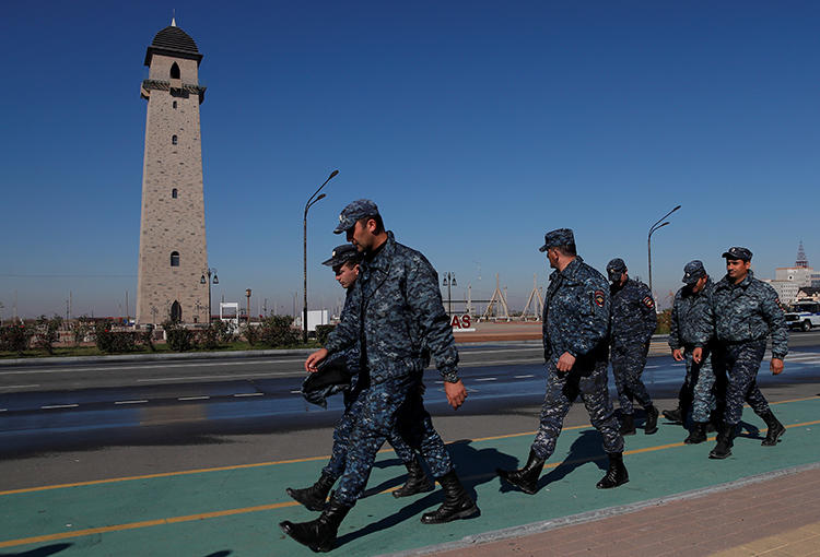 Police officers are seen in Magas, Ingushetia, on October 8, 2018. FSB agents in Ingushetia recently detained and allegedly tortured journalist Rashid Maysigov. (Reuters/Maxim Shemetov)