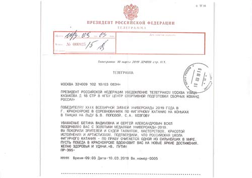 А вот его дочь – Бета Вадимовна – сначала дважды становилась чемпионкой Москвы по фигурному катанию, а около 2-х месяцев назад завоевала золотую медаль на последней универсиаде. Т.е., образно говоря, стала чемпионкой мира среди студентов. С чем её поздравил президент Российской Федерации В.В. Путин.