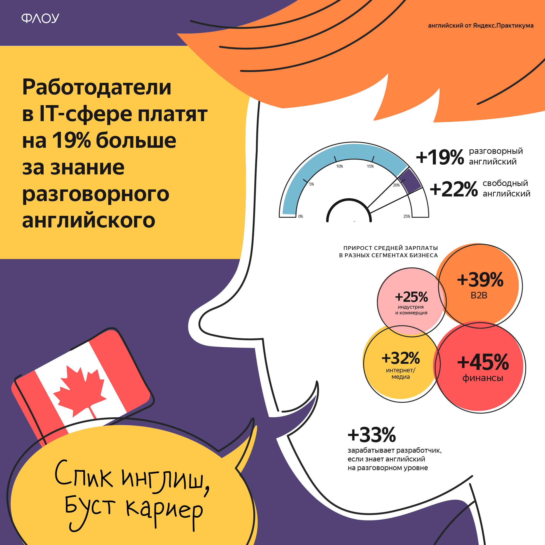 Курсы подходят тем, кто хочет за полгода начать говорить на английском. Именно способность говорить и решать рабочие ситуации на английском языке становится все более востребованной на рынке труда. Это показало исследование 650 тыс. вакансий специалистов различного профиля*: работодатели сферы IT, финансов, медиа и развлечений готовы платить на 19% больше за знание языка на разговорном уровне. Спрос на таких специалистов только в 2019 году вырос в 3 раза.