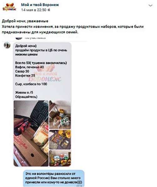 Пользователи воронежских соцсетей выложили скриншоты переписки с девушкой, которая предлагала своим соседям по жилому комплексу продукты по низким ценам. Точно такие же продукты входили в состав бесплатных продуктовых наборов для помощи нуждающимся. Об этом 17 мая сообщило издание «Вести. Воронеж».