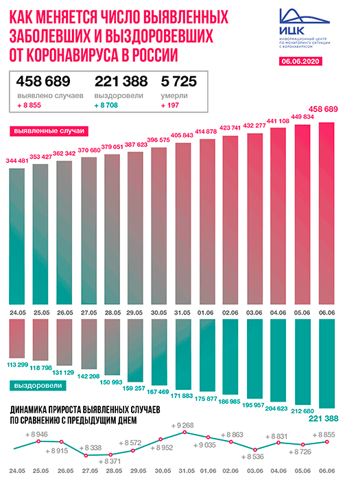 В Российской Федерации нарастающим итогом зарегистрировано 458 689 случаев (+2,0%) коронавирусной инфекции в 85 регионах.