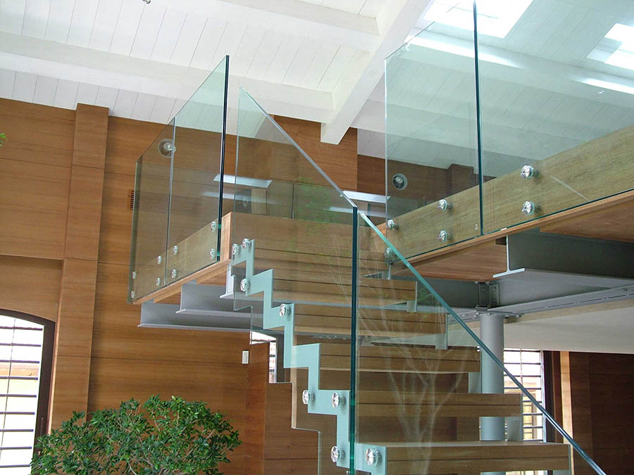 Существуют такие варианты креплений: точечное (используется специальный крепеж), стоечное (установка стекла осуществляется в плоскость лестницы), ограждение в шине (стеклянные полотна фиксируются в алюминиевый профиль).